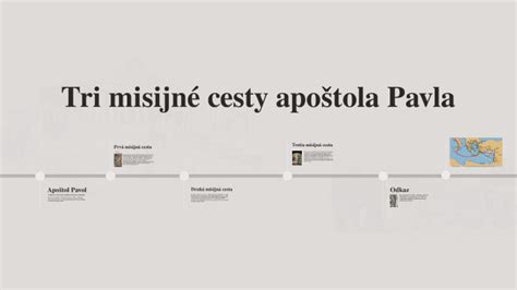 | Prvá misijná cesta | 47-48 | Barnabáš, Ján Marek | Cyprus, južné provincie Malej Ázie (Antiochia v Pizídii, Ikónium, Lystra, Derbe) |