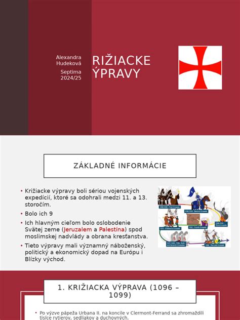 - 1. výprava (1096-1099): Križiaci z Francúzska, Nemecka a Sicílie dobyli Jeruzalem a založili Jeruzalemské kráľovstvo. Zabitých veľa ľudí, hlavne ženy a deti.