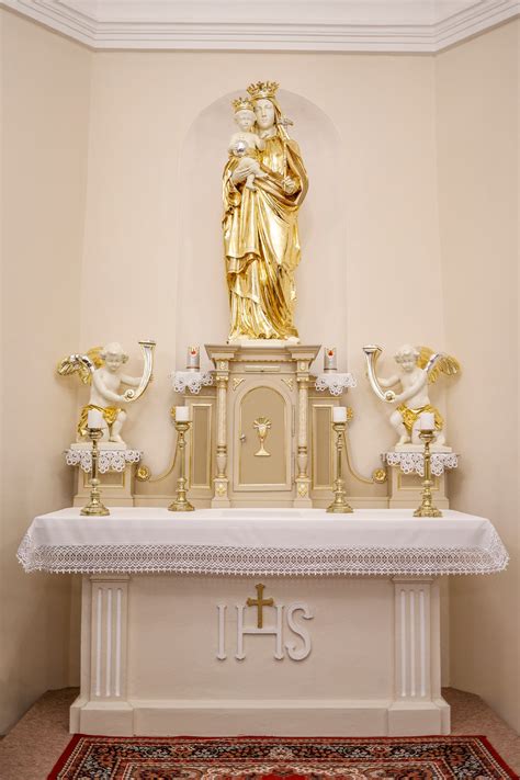 Hlavný oltár tvorí štuková stĺpová architektúra s baldachýnom a rokokovým ornamentom. Pod klenbou je alegória Najsvätejšej Trojice s oblakmi a anjelmi. Po stranách sú drevené sochy svätého Petra a Pavla v životnej veľkosti. Dva umelecky vyrezávané drevené svietniky vysoké asi tri metre (zo 17.stor.) nesú večné svetlo. V strede je umiestnený obraz Nanebovzatia Panny Márie zakúpený vo Viedni z príležitosti posvätenia kostola. Bočné oltáre s obrazmi sv. Jána Nepomuckého a sv. Jozefa pochádzajú z 18. storočia. Sú ozdobené krútenými piastrami a štítom. Tu sa nachádza aj umelecky kovaný svietnik na veľkonočnú sviecu paškál - dar richtára obce z roku 1816.