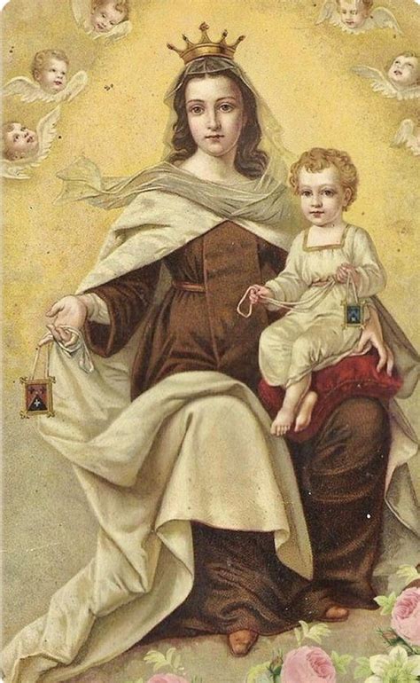 Po Kristovej pravici stojí Panna Mária - Kráľovná Karmelu. Na rukách drží dieťa Ježiša a s vrúcnou láskou ho túli k sebe, akoby ho chcela chrániť pred temnotami, ktoré sú navôkol. Zatiaľ čo malý Ježiš má - podobne ako veľký - prenikavý milosrdný pohľad, Panna Mária má zatvorené oči. Nie žeby spala. Je to Panna započúvaná do Slova. Slovo nosí v sebe a nesie ho pred sebou; nespí, ale vo svojom srdci o ňom premýšľa. Ježiško ponúka škapuliar - znak zmluvy a vzájomného spoločenstva medzi Pannou Máriou a veriacimi.