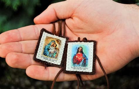 Mariánska úcta karmelitánskej rehole našla zvláštne vyjadrenie v tzv. škapuliari. Ako vieme, škapuliar (z lat. scapulare - náplecník) v pôvodnom význame je súčasť rehoľného, predovšetkým mníšskeho odevu. Je to pás látky (okolo 40 cm široký s otvorom pre krk a hlavu), ktorý splýva z pliec vpredu i vzadu. Menší alebo stredný škapuliar nosia členovia tretieho rádu patričnej rehole. Tretí, malý škapuliar, pozostáva z dvoch malých štvorčekov takej istej látky (spojených tenkými stužkami alebo šnúrkami) a je určený pre nečlenov rehole.