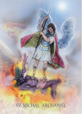 Svätý Michal archanjel, bráň nás v boji, proti zlostiam a úkladom diablovým. Pokorne prosíme, nech mu Boh ukáže svoju moc. A ty, knieža vojska nebeského, mocou Božou zažeň do pekla satana a iných zlých duchov, ktorí sa na skazu duší po svete potulujú. Amen.