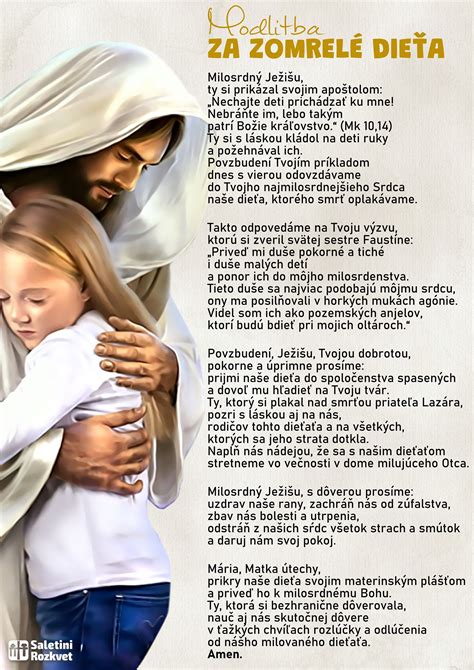Daj, nech božie prikázania sú ich životnou smernicou, nech vo svätom náboženstve nachádzajú útechu v utrpení a životných trápeniach. Mária, moja milá Matka, nepochybujem, že ich budeš matersky ochraňovať, že budeš bdieť nad mojou rodinou. Všetkým nám vypros milosť, aby sme nikdy nezabudli utiekať sa pod tvoju ochranu. Svätá Panna, naša Matka ustavičnej pomoci, pre tvoju nežnú lásku k dieťaťu Ježišovi vezmi pod svoju ochranu malé deti, ktoré Boh tak veľmi miluje. Neprosím len o ich telesné zdravie, ale odporúčam ti aj ich čisté, nepoškvrnené duše. Chráň ich pred zlými priateľmi, pred vplyvom zlého prostredia, nech si zachovajú nevinné, nepoškvrnené srdcia.