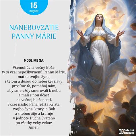 Uprostred augusta slávime sviatok Nanebovzatia Panny Márie. Tento výnimočný deň oslavuje vieru, že Panna Mária bola po skončení svojho pozemského života prijatá do neba s telom i dušou.