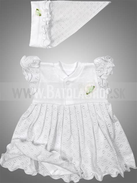 Nádherný set pre dievčatká na ich prvý veľký deň - deň krstu. Šaty sú z ľahkej bielej bavlny ideálne na leto, zdobené volánikmi na krátkych rukávoch. V hornej časti sú prešité a zdobené dvomi motýlikmi. K šatám je aj klobúčik a kraťasy, všetko zdobené s jemnými kvietkami, ktoré majú perforovanie aby boli vzdušné a Vaše bábätko sa cítilo čo najpohodlnejšie.