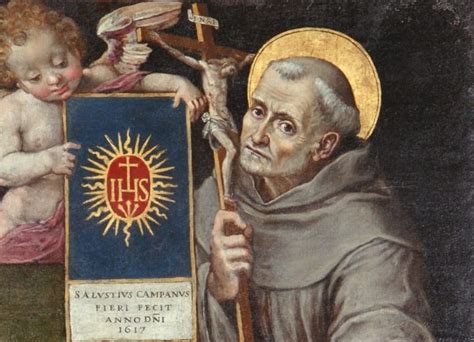 Svätý Bernardín Albizeschi sa narodil niekoľko mesiacov po smrti svojej slávnej rodáčky svätej Kataríny Sienskej v šľachtickej rodine neďaleko Sieny. Po štúdiách cirkevného práva a po uzdravení z choroby, ktorou sa nakazil pri ošetrovaní chorých morom, vstúpil k františkánom. Stal sa kňazom, vynikajúcim kazateľom a šíriteľom úcty k menu Ježiš po celom Taliansku na veľký osoh duší. Na jeho kázne prichádzalo veľké množstvo ľudí. Nehovoril o pohromách ohlasujúcich koniec sveta, ako bolo vtedy zvykom, ale o Ježišovi Kristovi a o jeho božskej láske.