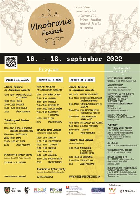 Jeseň na Západnom Slovensku sa už tradične nesie v duchu hodov a vinobrania. Pezinské vinobranie sa každoročne koná počas tretieho septembrového víkendu, pričom slávnosť začína už v piatok podvečer. Prijmite naše pozvanie a príďte sa zabaviť na tradičné oberačkové slávnosti. Lahodné mladé víno, čerstvo pripravený burčiak či skvelá husacina s lokšami, to všetko a ešte omnoho viac na Vás čaká v uliciach centra mesta Pezinok.