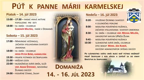 Pozvánka na Púť k Panne Márii Karmelskej. Pozývame všetkých ctiteľov Panny Márie Karmelskej na púť, ktorá sa bude konať v dňoch 20. a 21. júla vo Farskom kostole v Domaniži. Zvlášť pozývame tých, ktorí túžia po prijatí ochranného rúcha Panny Márie vo forme škapuliara. Pozývame vás na Púť k Panne Márii Karmelskej v Domaniži, ktorá sa uskutoční 20. - 21.
