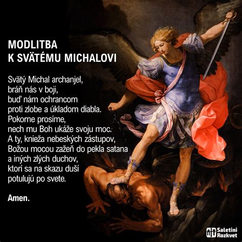 Svätý Michal archanjel, bráň nás v boji, buď nám ochrancom proti zlobe a úkladom diabla. Pokorne prosíme, nech mu Boh ukáže svoju moc. A ty, knieža nebeských zástupov, Božou mocou zažeň do pekla satana a iných zlých duchov, ktorí sa na skazu duší potulujú po svete.