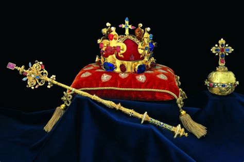 Uhorské korunovačné klenoty (koruna, žezlo, jablko) a meč svätého kráľa Štefana.