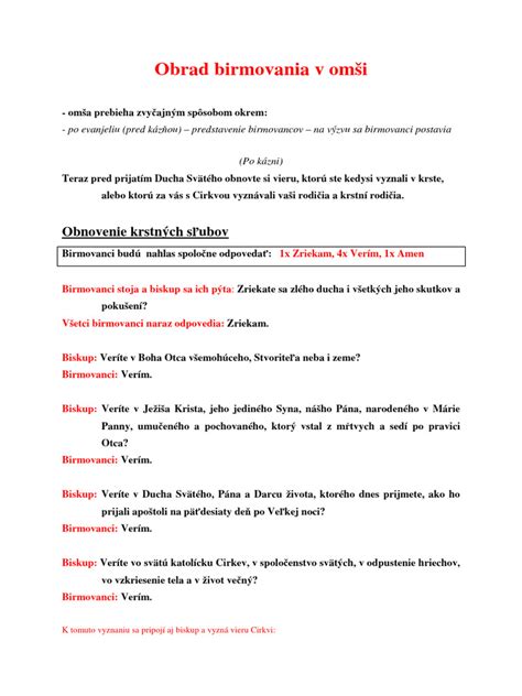 „Všemohúci Bože, Otec nášho Pána Ježiša Krista, ty si znovuzrodil z vody a z Ducha Svätého týchto našich bratov a sestry a oslobodil si ich od hriechu. Otče, zošli na nich Ducha Svätého Obhajcu, udeľ im ducha múdrosti a rozumu, ducha rady a sily, ducha poznania a nábožnosti a naplň ich duchom bázne voči tebe.