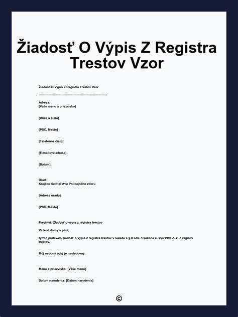Žiadosť o výpis z registra trestov môže podať a výpis z registra trestov prevziať aj osoba splnomocnená žiadateľom. doklad, ktorým preukazuje svoju totožnosť (§ 12 ods. meno, priezvisko a rodné priezvisko rodičov (§ 12 ods. Totožnosť žiadateľa sa overuje (§ 12 ods.